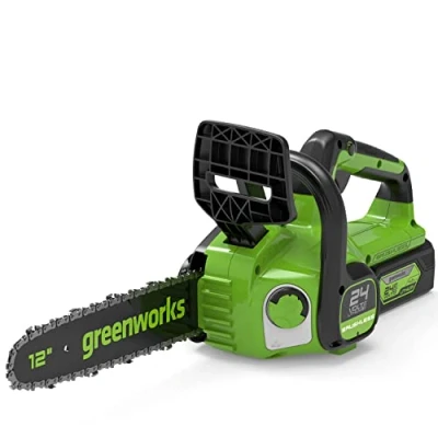 POWERFUL, LIGHTWEIGHT AND COMPACT 30cm CHAINSAW - weighing only 2.6kg with comfortable, ergonomic soft-grip handles and a 30cm blade for cutting logs or firewood, pruning shrubs and coppicing branches EFFICIENT, SAFER, SPEEDY CUTTING - brushless motor gives unmatched power and run time yet maintains a fast chain speed of 7.8m/s to quickly and cleanly cut timber, and for safety, the chain stops instantly if the chainsaw recoils due to kickback CHAIN IS EASY TO TENSION AND AUTOMATICALLY OILED - toolless chain adjustment means no fiddling about when you adjust the chain tension and the chain stays lubricated with an automatic oiling system that has a 200ml translucent tank USE WITH ANY GREENWORKS 24V 2Ah or 4Ah BATTERY - this is a special 'tool only' package that comes without a battery, so if you already own a Greenworks 24V tool you can use the same battery to save space, cut costs and reduce waste 3 YEAR GUARANTEE – by Greenworks, a world leader in electric tools and battery technology, with a global reputation for smart design, high performance and outstanding customer service, Weight: 5.6658801334 Pounds, Manufacturer: Greenworks