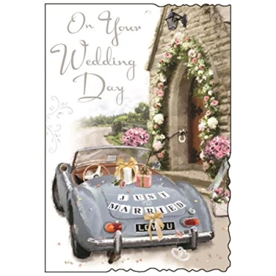 Greeting Card (JJ8595) Wedding On Your Day Church & Car Velvet Range Embossed, Flitter and Foil Finish