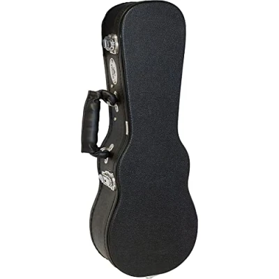 Standard Soprano Ukulele Case Comfortable handle. 5 ply hardwood shell, Black Tolex covering Black plush interior lining. Chrome coloured hardware. Black stitching Screwed in neck brace. Locking latch and key Approx Internal Dimensions:; Length:54.5cm; Depth:10.5cm; Upper Bout:13.5cm; Lower Bout:18cm;Waist: 13cm: Bottom to Neck:27cm