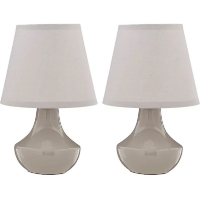 General description Elegant in design and functional in use, the set of 2 grey table lamps will illuminate your space with light and style. The lamps feature a traditional flask-inspired design with smooth and durable ceramic bases, complemented by tapered grey fabric shades that emit a soft glow to the surrounding area. An in-line cable switch makes it easier to switch the light on and off, adding convenience to their stylish appeal.