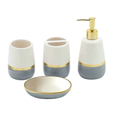 Our grey with gold hand painted bathroom accesories are made of high quality ceramic. This VASBODER morden designed set include soap dispenser pump, toothbrush holder, tumbler and soap dish. Decorate your bathroom, they keep your bathroom clean, tidy and orderly. This will be a good gift for your lover, family, friends and colleagues, and will add life to the bathroom. The stylish design makes it an ideal choice for modern bathrooms. This set of bathroom accessories adds alluring charm to any bathroom. It is suitable for homes, hotels, office buildings and other uses We provide 365 days money back guaranteed if there is any not satisfy with you. Just feel free to buy one set for your bathroom without any worry.