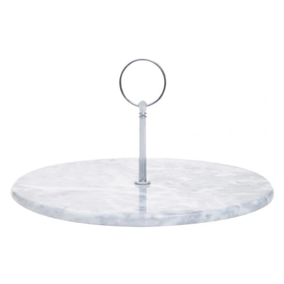 General description This Premier Housewares Grey Marble Cake Stand combines elegance and functionality, bringing an organic appeal to your tabletop. Crafted from grey marble with subtle white hues, it features a round shape that enhances its aesthetic charm. The hoop-shaped handle in a silver finish is securely fixed at the center, allowing for easy lifting and serving.