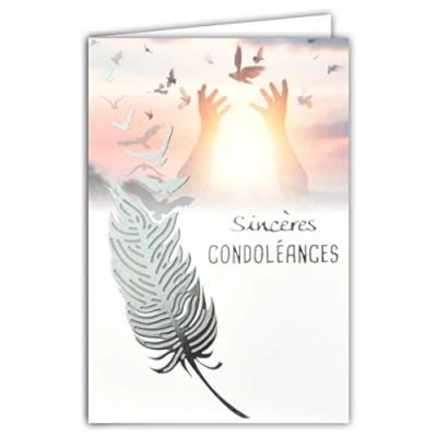 Grey Silver Shiny Excess Deuil Feather Fly Birds Peace Hands to The Sky Sun Hope Card Made in France