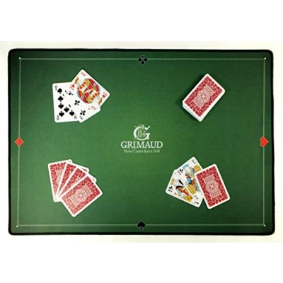 This 40 x 60 cm belote mat with a curved edge will allow you to play cards and will facilitate the distribution and exchange of cards between players. All the know-how of Master Cartier Grimaud is found in this accessory for all card game lovers. Non-slip, it adheres perfectly to the game stands. It will be ideal for playing Belote comfortably. Rug in green with "Grimaud" print. Grimaud, Master Cartier since 1848., Manufacturer: Cartamundi