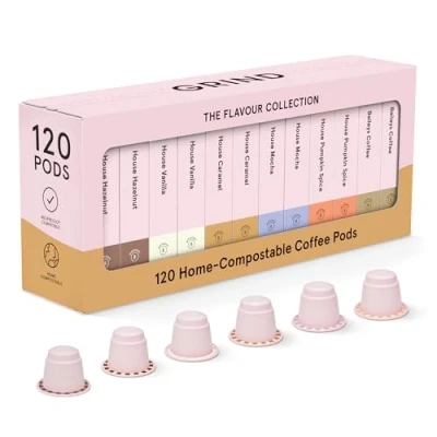 GRIND COFFEE CAPSULES: Speciality-grade coffee in home-compostable pods made from plants. Compatible with original style Nespresso machines, excluding Vertuo machines. FLAVOUR VARIETY PACK: This flavoured coffee collection pack includes six different flavoured coffee blends, from our malty sweet Caramel Blend to our iconic Baileys coffee. All of our coffee is ethically sourced from sustainable farms, and all our pods are 100% plastic-free and biodegradable. TASTE: Our flavoured coffee pods combine the chocolatey and nutty flavours of our signature House Blend with the subtle sweetness of your favourite flavours. B CORP CERTIFIED: Grind is committed to using business as a force for good, prioritising the planet and its people, always. That means roasting speciality coffee that’s ethically sourced from sustainable, small-scale farms, avoiding single-use plastic, and creating a variety of blends for all the ways people drink their coffee. QUALITY: We've been serving speciality-grade coffee from our cafés for over a decade. Everything we've learnt is packed into our home-compostable coffee pods, so you can take the café experience home with you.