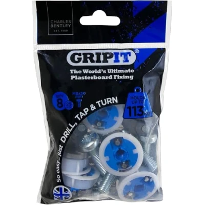 SECURE HEAVY LOADS WITH TOTAL CONFIDENCE: Install your wall-mounted TV, kitchen cupboards, or water heater with the strength and reliability of Gripit Blue heavy duty plasterboard fixings. Designed to hold up to 113kg, these fixings are the perfect solution for plasterboard wall plugs, drywall anchors, and stud wall fixings when strength and durability are essential. Innovative Wing Technology for Maximum Grip: Grip it fixings feature a unique slim wing system made from industrial-grade polyacetal. Once installed, these wings expand behind the plasterboard, providing a superior hold compared to ordinary plaster board wall plugs or plasterboard anchors. Whether you’re securing a TV bracket, wall-mounted cupboard, or boiler, these fixings ensure long-lasting stability. Quick, Easy, and Stress-Free Installation: Suitable for 9.5mm to 15mm plasterboard, Please use a 15mm drill bit to install Gripit Blue. Simply mark the spot, drill, tap the fixing into the hole, and twist to secure. Perfect for DIYers and professionals fitting, plasterboard TV mount fixings, dry wall anchor screws, or tv bracket fixings. Durable, Reusable & Adjustable: These plasterboard fixings are designed to be removed and reused without damaging your wall, making repositioning or adjustment simple. Ideal for long-term, sustainable use in home and professional environments. IMPORTANT USAGE CAUTION: "Hand-tighten only. Do not overtighten or use power tools." Gripit fixings are not suitable for damp or damaged walls, or for items involving continuous movement, rotation, or vibration. Brackets must sit flush against the wall. Not compatible with cantilever or full-motion TV brackets. Maximum weight refers to the shear load on 15mm plasterboard (i.e., load suspended vertically downward). All Gripit fixings are independently tested on 15mm plasterboard for verified performance., Weight: 0.220462262 Pounds, Manufacturer: Grip It