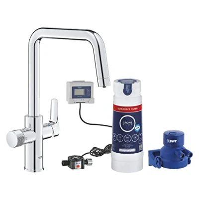 Grohe Blue Pure Start Filtered Water Starter Kit with Ultrasafe Filter - U-Spout - Chrome. GROHE Blue Pure Start Starter Kit with Ultrasafe filter turns ordinary tap water into pure drinking water free from lead, bacteria and microplastics. Know that your table water is a free from impurities as it can be with the GROHE Blue Pure Start kitchen tap with Ultrasafe filter. The refreshed design offers easier operation, with the knurled rotary knob for sourcing delicious drinking water now at the same level as the single-lever handle that provides mixed, unfiltered water for your daily kitchen chores. There are separate inner waterways to ensure filtered and unfiltered water do not mix. The high U-spout with 150° swivel action is practical – perfect for filling and cleaning larger pots or carafes. The durable GROHE Long-Life Shine finish is wipe-clean and will maintain its good looks effortlessly through years of use. Designed for single-hole installation, the tap can be fitted in no time with the tool-free GROHE FastFixation 2.0 connection system. The GROHE Blue Ultrasafe filter system employs a multi-stage process to remove microplastics (>1µ), 99.999% of bacteria and 99.5% of lead from source water, and also reduces the presence of substances that leave an unpleasant taste or odor such as chlorine. It is compact enough to fit neatly under the sink and delivers up to 3000 litres of purified water – or six months’ use – before it must be replaced. A flow meter monitors the lifetime of the filter cartridge. GROHE Blue Pure is the easy, sustainable way to delicious drinking water straight from the tap. Consisting of: GROHE Blue single-lever sink mixer with filter function Monobloc installation C-spout Separate handle for filtered water 28 mm ceramic cartridge with GROHE SilkMove swivel tubular spout swivel area 150° separate inner water ways for filtered and non-filtered water flexible connection hoses Quick-Fix fixation Grohe Blue filter head Grohe Blue Ultrasafe filter (filter capacity is 3000L, and must be replaed after 6 months of use) flow meter for filter lifetime measurement including 2 x AA batteries Genuine brand new Grohe product, covered by a Grohe manufacturer's guarantee.