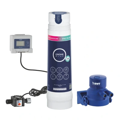 Grohe Blue Ultrasafe Filter Starter Set. The GROHE Blue Ultrasafe filter starter set takes source tap water and transforms it into pure drinking water free from lead, bacteria and microplastics Enjoy safe, pure drinking water at home straight from the tap, with no fuss and no clutter, thanks to the compact GROHE Blue UltraSafe filter starter set. It is the ideal system for areas where water is not safe to drink straight from the tap. Using a multiphase filtration process it removes larger particles like sand and dirt, chlorine and certain organic compounds that cause an unpleasant odor and taste, 99.5% of lead, and even the smallest particles like microplastics (> 1 µm) and 99.999% of bacteria. The process transforms source water into pure drinking water – free of lead, microplastics and bacteria. The filter has a capacity up to 3000 litres and must be replaced after 6 months of use. A flow meter with digital display powered by two AA batteries monitors the lifetime of the filter and lets you know when it needs to be replaced. Simply unscrew the used cartridge and screw in the replacement. The filter set is compact and designed to occupy a minimum of space in the under-sink cabinet. And it’s compatible with all GROHE Blue Pure single Taps. Genuine brand new Grohe product, covered by a Grohe manufacturer's guarantee.