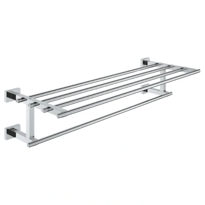 Grohe Essentials Cube Multi-Towel Rack - Chrome Make intelligent use of your bathroom space with the GROHE Essentials Cube towel rack. The horizontal rack above is perfect for storing folded towels while another dries on the rail below. The cubic shape and clean lines make it an ideal choice for contemporary bathrooms, and in a dazzling, durable GROHE StarLight chrome finish, it will look immaculate for years to come. Concealed fixings Length 600mm (useable length 558mm) Grohe StarLight chrome finish Material: metal Genuine brand new Grohe product, covered by a Grohe manufacturer's guarantee.