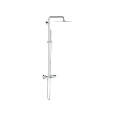 Features of the Euphoria System 230 Shower system with thermostat for wall mounting, Chrome (26187000): Horizontal swivable 450 mm projection shower arm Exposed thermostatic shower with Aquadimmer function Allows change between: head shower Allure 230 (27 479 000) Material: metal Rain spray pattern With ball joint Rotation angle ± 15° Hand shower Euphoria Cube Stick (27 698 000) Adjustable height via gliding element (12 140 000) Silverflex shower hose 1750 mm (28 388 000) Technologies : GROHE TurboStat compact cartridge with wax thermoelement GROHE SafeStop safety button at 38°C ( calibration required ) GROHE SafeStop Plus optional temperature limiter at 43°C included GROHE DreamSpray perfect spray pattern GROHE StarLight chrome finish SpeedClean anti-limescale system Inner WaterGuide for a longer life Twistfree preventing the hose from twisting GROHE MetalGrip ergonomically shaped metal handles Suitable for instantaneous heaters from 18 kW/h Minimum flow rate 7 l/min. Optional