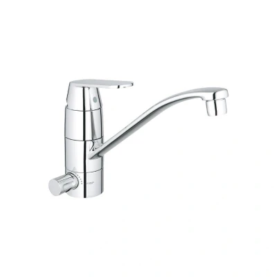 Grohe Eurosmart Cosmopolitan Single Lever Sink Mixer - Chrome Stylish and built to last, this Eurosmart Cosmopolitan kitchen tap is cleverly designed with an integrated stop valve so you can easily cut off the water to your dishwasher whenever necessary. As a single-lever tap it’s easy to operate and it has a cutting edge GROHE SilkMove ceramic cartridge so you can control water temperature and flow with smooth and effortless precision. With a quick wipe of a microfiber cloth it’s easy to clean the scratch resistant chrome coating which has a sparkle that will last for years. The Eurosmart Cosmopolitan kitchen tap – blending beautiful modern style and premium quality for your kitchen convenience. Integrated stop valve Low spout Monobloc installation Grohe StarLight finish Grohe SilkMove 46mm ceramic cartridge Mousseur Adjustable flow rate limiter Swivel tubular spout Swivel area 140º Flexible connection hoses Rapid installation system Genuine brand new Grohe product, covered by a Grohe manufacturer's guarantee.