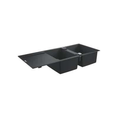 GROHE K500 Quartz Composite Double Sink with Drainer (Reversible Top Mount, Overflow and Automatic Waste Fitting Rotary Handle, Both Bowls 33 x 44 20 cm), 116 50 cm, Granite Black, 31647AP0