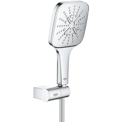 General description The Grohe Rainshower Smartactive 130 Cube Wall hand shower holder set includes a stylish hand shower and a 1.5m hose, designed for a modern bathroom experience. The set features an adjustable wall shower holder and is finished in a sleek chrome that complements any decor. Technical specifications Hand shower model: Rainshower SmartActive 130 Cube Hose length: 1500 mm Flow limiter: GROHE EcoJoy 9.5 l/min Number of jets: 3 Hand shower diameter: 130 mm Material: ABS Weight: 1 kg Compatibility and accessories Suitable for instantaneous heaters Usage Features GROHE DreamSpray for a perfect spray pattern Includes SpeedClean anti-limescale system for easy maintenance Inner WaterGuide technology for a longer lifespan Twistfree design prevents the hose from twisting during use