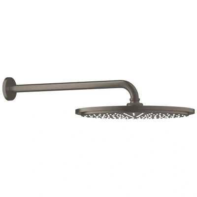 ManoManoGeneral description Experience a luxurious shower with the Grohe Rainshower Cosmopolitan 310 Shower Head and Arm Set. This set features a spacious 310 mm shower head that delivers a refreshing rain-like experience, complemented by a sturdy 380 mm shower arm. The elegant brushed hard graphite finish adds a modern touch to your bathroom decor. Technical specifications Shower head diameter: 310 mm Shower arm length: 380 mm Flow rate: 8 l/min (GROHE EcoJoy) Height: 1.5 cm Weight: 1.5 kg Other information GROHE DreamSpray technology for an even spray SpeedClean® anti-limescale feature DropStop technology prevents water run-off after turning off 5-year manufacturer warranty