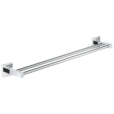 Grohe Start Cube Double Towel Bar 600mm - Chrome (41104000). Part of the Grohe QuickFix Accessory Range. GROHE QuickFix – For surprisingly easy bathroom and kitchen makeovers! Never tried changing fittings yourself? With QuickFix you can do it. Save money - do it yourself! No more missing tools or instructions - QuickFix has all you need for a successful renovation. As a part Grohe's easy installation promise, QuickFix products come with a smart installation feature or tool, making every installation a breeze. If you prefer how-to guides, scan the QR code and Grohe through the installation - see all the QuickVideos. Alternatively, if you prefer to look through a guide, confusing instructions are a thing of the past! Grohe's QuickGuide provides easy guidence for a smooth installation. Thanks to GROHE QuickFix anyone can achieve the perfect makeover with ease. They'll show you how easy it can be. That's a promise! Stylish, easy to fit and built to last, the GROHE Start Cube double towel rail is a great way to give your bathroom a quick upgrade. Crafted from the finest materials, it compliments any modern bathroom. And with concealed fastening it has a beautiful finish that looks truly professional. The double towel rail, which has a handy length of 600mm (useable length 600mm), features the durable, easy-to-clean GROHE Long-Life Shine coating that sparkles for a lifetime. But don’t forget how easy it is to install with the screws and dowels, which are included. Plus, if you want to create a seamless bathroom design with matching accessories, then don't forget the complementary glass shelf, multi towel rack, rectangle shower basket. soap dispenser, triangle shower basket and toilet paper holder. GROHE Start Cube – elegant designer accessories that boost your bathroom style and convenience! Material: metal. 654 mm (useable length 600 mm). Concealed fastening. GROHE Long-Life finish. Suitable for screwing (including screws and dowels). Not suitable for mounting by Glue. @9cBzOJJPJl8@ Genuine brand new Grohe product, covered by a Grohe manufacturer's guarantee.