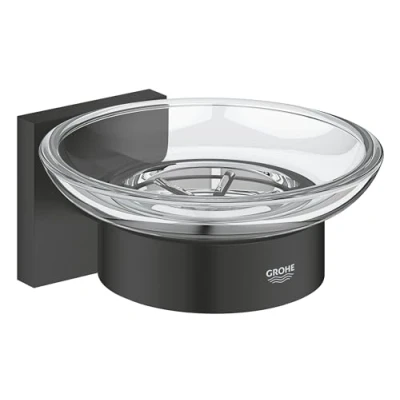 GROHE Start Cube QuickFix Soap Dish with Holder (Material: Glass and Metal, Wall Mounted, Concealed Fastening, Screws Dowels), Size 125 mm, Easy to Fit QuickGlue, Matt Black, 410962430