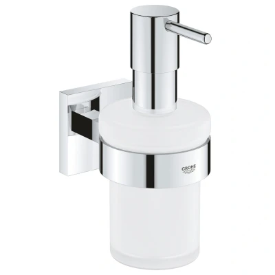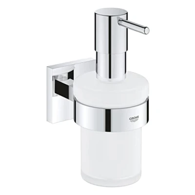 National Shower SparesGrohe Start Cube Soap Dispenser With Holder - Chrome (41098000). Stylish, strong and surprisingly easy to fit! With the GROHE Start Cube soap dispenser with holder it’s quicker than ever to add an accessory that boosts bathroom style and convenience – so washing your hands will suddenly be much more enjoyable. Elegant and designed in Germany from the finest materials, it looks perfect in any modern bathroom. And with concealed fastening it has a beautiful finish that looks truly professional. The set also features GROHE Long-Life Shine, a durable, easy-to-clean chrome finish that sparkles for years. But don’t forget how easy it is to install! It can be screwed to the wall (screws and dowels included) or, for an even more convenient solution, glued! All you need is GROHE QuickGlue (for one mounting plate 41127000, sold separately). Just check out our QuickGuide and QuickVideos (below) to see how easy it is to fit. A spare dispenser is also available (41188000). Material: glass / metal. Filling quantity 160 ml. Concealed fastening. GROHE Long-Life finish. Suitable for screwing (including screws and dowels) or gluing (GROHE QuickGlue A1 41127000 sold separately) holding force: max. 5 kg. The specified holding capacity is valid for static (slowly applied) load and intended use only. @0Lz4JxiVLSA@ @D7YN_EWHhwA@ Genuine brand new Grohe product, covered by a Grohe manufacturer's guarantee.