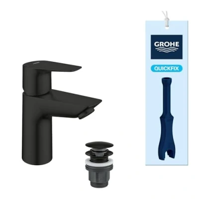 GROHE Start Edge QuickFix Smooth Body Basin Mixer Tap with Push Open Waste Set (S Size, 28 mm Ceramic Cartridge, Energy & Water Saving, Tails 3/8 Inch, QuickTool Included), Matt Black, 239002431