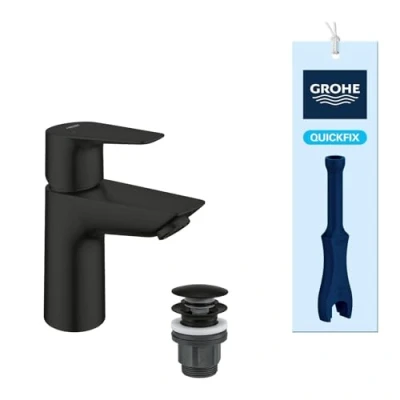 GROHE Start Edge QuickFix Smooth Body Basin Mixer Tap with Push Open Waste Set (S Size, 28 mm Ceramic Cartridge, Extra Water Saving Low Flow, Tails 3/8 Inch, Tool Included), Matt Black, 238982431
