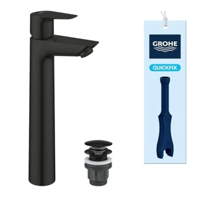 EXTRA-TALL DESIGN FOR FREE-STANDING BASINS: Specifically engineered for free-standing and countertop basins, the XL-Size profile provides the necessary height and reach for comfortable handwashing; The smooth body design and metal lever offer a clean, minimalist aesthetic for modern bathroom layouts LEAD-FREE PROTECTED WATER WAYS: Ensure safer drinking water with Protected Water Ways technology; The internal water flow has no contact with lead or nickel inside the tap, providing peace of mind and meeting high standards for water purity and hygiene PRECISE CONTROL & TEMPERATURE LIMITER: Equipped with a 28 mm ceramic cartridge, this mixer offers smooth, effortless control over water volume; An integrated temperature limiter allows you to set a maximum water temperature to prevent scalding and increase safety for all users ECO-FRIENDLY SAVINGS & PUSH-OPEN WASTE: Save water without compromising performance with a flow rate limited to 5 l/min (at 3 bar); This set includes a 1 1/4" plastic push-open waste set, allowing you to open and close the drain with a simple fingertip touch RESILIENT FINISH & QUICKTOOL INSTALLATION: Our specialized surface coating is designed to resist scratches and tarnishing for a long-lasting, clean appearance; Save time on the monobloc installation with the included GROHE QuickTool, which simplifies tightening the connection hoses and securing the single-hole fitting, Weight: 4.7840310854 pounds, Manufacturer: GROHE