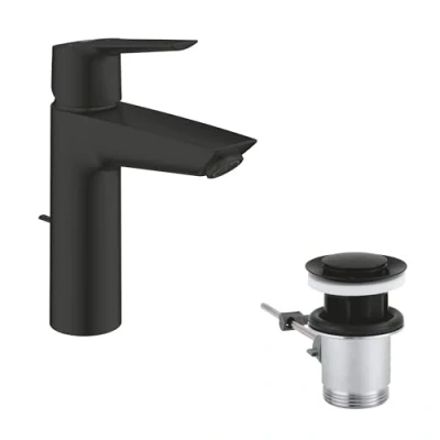 GROHE Start QuickFix Basin Mixer Tap with Pop Up Waste Set (M Size 192mm, 28 mm Ceramic Cartridge, Water and Energy Saving, Tails 3/8 Inch, Easy to Fit QuickTool), Matt Black, 235522432