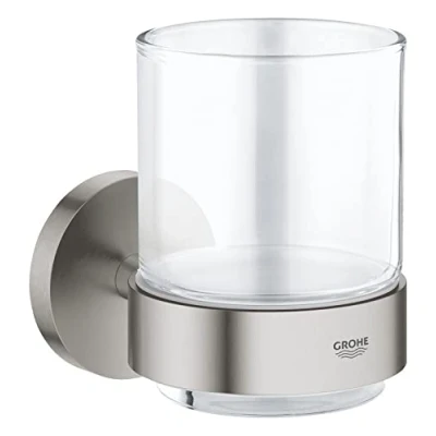 GROHE Start QuickFix Crystal Glass with Holder (Metal and Glass, Concealed Fastening, Including Screws Dowels, Easy to Fit QuickGlue), Size 106 x 99 mm, Stainless Steel Look, 41194DC0