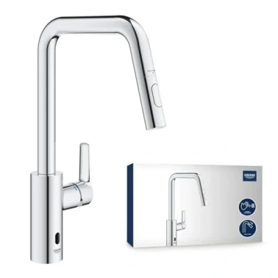 GROHE Start QuickFix Hybrid Pull Out Kitchen Tap for Touchless or Manual Operation (High U Spout 381 mm, 28 mm Ceramic Cartridge, 150 Swivel Area, Dual Spray, Tails 3/8 Inch), Chrome, 1012430000