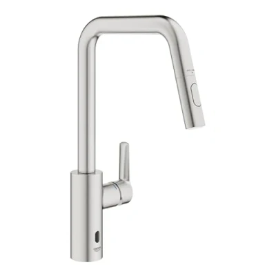 GROHE Start QuickFix Hybrid Pull Out Kitchen Tap for Touchless or Manual Operation (High U Spout 381 mm, 28 mm Ceramic Cartridge, 150 Swivel Area, Dual Spray, Tails 3/8 Inch), Supersteel, 101243DC00