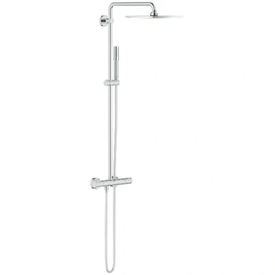 ManoManoFeatures of Vitalio Joy System XXL 230 Shower column with thermostatic mixer (26365000): 450 mm horizontally adjustable shower arm Thermostatic mixerincluding 2-way diverter function 230 x 230 mm shower head Metal Jet: Rain With ball joint Rotation angle ± 15° Hand shower Vitalio Get Stick(27458000) Height-adjustable slider Shower hose VitalioFlex Silver 1750 mm (27506000) GROHE DreamSpray perfectly even spray GROHE StarLight Chrome for a long-lasting shine GROHE TurboStat Quasi-instantaneous thermostatic regulation and shut-off in the event of a cold water failure. GROHE SafeStop limit stop at 38°C GROHE SafeStop Plus optional temperature limiter at 43°C included SpeedClean anti-limescale system Inner WaterGuide, for maximum longevity Anti-twist system Product range : Vitalio Joy Colour : Chrome Material : Brass Manufacturer colouring : Chrome Width (cm) : 29.8 Height (cm) : 220 Number of jets : 1 jet Head shower diameter (mm) : 230 Head shower shape : Round Type of mixer :