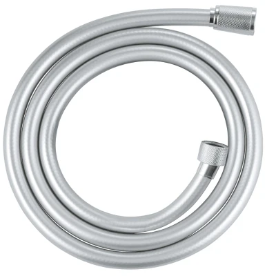 Grohe Vitalioflex Silver Long-Life 1.5m Shower Hose - Chrome (22109000). This GROHE VitalioFlex Silver Long-Life shower hose is stylish, low-maintenance and designed to fit easily into any modern bathroom makeover, and with a length of 1500mm it’s ideal for a shower system or shower rail set. This cleverly designed GROHE Long-Life strengthened model is built to revel in hard work and can withstand water pressure up to 12 bar, tension up to 50kg and heat up to 75°C. The smooth surface is easy to clean – one quick wipe with a dry cloth and it looks as good as new – and it won’t cause any damage if it comes into contact with the shower cubicle or bathtub. The AntiFold design ensures it won’t bend and end up with annoying kinks, while the TwistStop rotation cone prevents the hose from twisting. No tools needed – installation is surprisingly easy! Simply screw the shower hose on: The universal connections are compatible with all standard hand showers and mixers. And the GROHE ProGrip nuts have a durable GROHE Long-Life Shine chrome finish and a knurled surface for optimal grip and easy tightening. If you still need some guidance, watch our QuickVideo or have a look at the QuickGuide. 1500 mm. Smooth surface for easy cleaning. Rotation cone for TwistStop function. GROHE Long-Life strengthened model. Pressure resistance up to 12 bar. Tensile strength 500 N. Heat resistance 75°C. AntiFold bendproof. Universal connection G 1/2" x 1/2". GROHE ProGrip with knurl structure. GROHE Long-Life finish. @4m3gAekd2VE@ Genuine brand new Grohe product, covered by a Grohe manufacturer's guarantee.