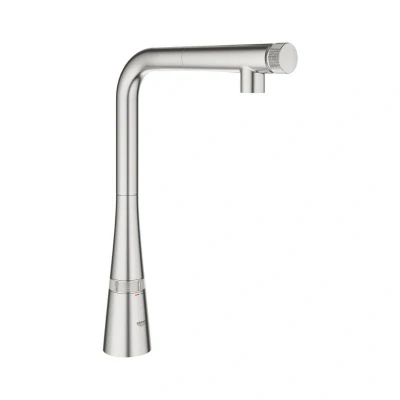 Grohe Zedra SmartControl Sink Mixer - Supersteel The sleek, conical design is intended for single hole installation. Thanks to the innovative SmartControl feature you can start and stop the water flow with just the push of a button. Turn to adjust the volume, from water-saving eco mode to full flow. You can even turn it on hands-free with just a press of your wrist or elbow. The temperature is easily adjusted via the mixing valve on the tap’s body. This tap leaves lots of comfortable working space for filling large pots or vases under the high L-shaped spout. The spout swivels through 140°, ideal for larger or double sinks. The pull-out spray head with laminar adds to the flexibility, making it easy to prep veg or clean the sink without splashing. GROHE Magnetic Docking means the spray head retracts smoothly back into place once you are finished. With the GROHE FastFixation Plus rapid installation system with flexible connection hoses you can be confident of a swift and simple fitting process. This monobloc kitchen mixer tap will look pristine for years to come as it has a durable GROHE StarLight finish using physical vapour deposition (PVD) for an extra level of scratch-resistance. Monobloc installation Grohe StarLight finish Pull-out spray with laminar Metal spray Grohe Magnetic Docking guarantees easy retraction and smooth docking of the spray head back to the starting position Grohe SmartControl push for ON-OFF, turn for volume adjustment from water saving eco mode to full flow Temperature adjustment by turning of mixing valve on body Swivel tubular spout Swivel area 140º Protected against backflow Flexible connection hoses Grohe FastFixation installation system Grohe Zero isolated inner water ways - lead and nickel free within the tap Genuine brand new Grohe product, covered by a Grohe manufacturer's guarantee.