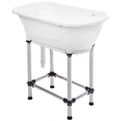 Plastic tub featuring sturdy metal leg frame Perfect for bathing small dogs, cats or other small animals Features a non-skid base Features hooks which you can attach a noose or strap to, to restrict your pet's movement during bathing No more stooping or bending while bathing your pet!