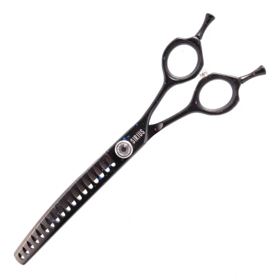 Groom Professional Sirius 6.5" 18 Tooth Curved Chunker The best-selling scissor from Groom Professional, Sirius perfectly represents this favourite brand by bringing reliability, style and function to your grooming routine. Made with 440c Japanese steel and expertly finished to easily cut through the thickest coats. Scissor Types Safety – A small grooming scissor for dogs with straight-edged blades but a rounded tip to avoid punctures. Particularly useful for more delicate work in intricate areas. Straights – The original scissor; primarily designed to cut away large quantities of hair as efficiently as possible! Curved – 2 straight-edged blades but designed at a curve. Useful for a variety of situations, rounded styles, intricate areas or anything else that requires some more curves. Thinners – Two blades with teeth – perfect for thinning the coat, not necessarily cutting! Blenders – One straight-edged blade accompanied by a toothed blade – Perfect for blending to create well-balanced styles. Chunkers – Blenders but with thick gaps between the teeth. Perfect for styling and creating angles when you need a softer cut than a straight can provide. Designed for coats with volume. Scissor Levels Level 1 : Entry-level scissors – designed to remain sturdy and sharp for as long as possible. Best for those new to scissoring. Level 2 : Professional-level scissors – Designed with durability and everyday use in mind. Great for professional backups or groomers just starting out. Level 3 : Professional-level scissors – Designed to provide a high-quality finish while remaining durable for everyday use. Level 4 : Elite-Level scissors – Made to the highest standards to provide a beautiful finish and expert cut. Level 5 : The highest level of scissors – Designed to create the finest finish.