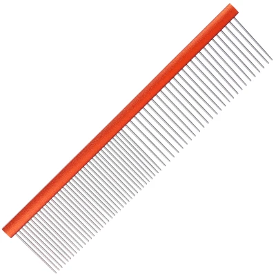 Spectrum Aluminium Comb 50/50 Range A perfect comb for small breeds, more intricate areas or finer coats. This comb features shorter length teeth measuring 28mm. The 50/50 spacing allows you greater versatility, especially when finishing toy breeds and fine coats. At 19cm, the comb length allows you greater control. Features an aluminium spine and stainless steel teeth. This gives nicer balance in the hand while offering a comb which glides through the coat and stands the test in a professional salon. For fine coats Short 28mm teeth 50/50 teeth spacing 19cm comb Aluminium spine & stainless steel teeth