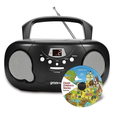 - Listen to your favourite classic albums on this Groov-e Boombox - it has a CD player- With its AM and FM radio, you'll have plenty of stations to choose from- There's a children's stories CD included in the box to keep your kids entertained- Its LED display lets you know which station you're on- Carry it along to make a grand gesture with your music, it also runs on battery