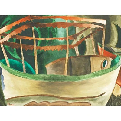 Großes Wandbild mit Taubenmotiv, Fischerboot, grünes Gemälde