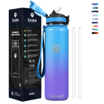 ✔【High Quality Material】Grsta insulated water bottle is made of 18/8 stainless steel metal material, BPA free, safe and durable. Gourde 1l uses double layer vacuum insulation technology to maintain the taste and temperature of your favorite drinks for a long time, allowing you to feel cool in the hot summer and warm in the cold winter. ✔【One-Click Opening Design】Drinking bottle with straw has a one-click opening function, which can be easily opened with one hand, allowing you to drink in seconds, ideal for hydration at school, office, gym or outdoor adventures, it is a great choice for daily use. ✔【100% Leak Proof】Metal water bottle comes with 360° silicone sealing ring and built-in silicone pad pad, making the seal more secure. The exterior is equipped with a anti-drip dust cover and a safety lock, When you close the lid, you can prevent the accidental opening of the water bottle in the backpack, It will be your best companion during camping, hiking, traveling and sports! ✔【EASY TO CARRY & EASY TO CLEAN】Stainless steel insulated water bottle comes with a hand strap, you can hold it in your hand or put it in your backpack and take it anywhere. Water bottle is easy to clean, there are no indentations prone to stains, and the wide mouth of the bottle has high visibility, You can observe the cleaning status of the thermos at any time and or add ice cubes or fruit. ✔【SUITABLE FOR VARIOUS OCCASIONS】 Gym water bottle fits most backpacks, cars and bicycle bottle holders, you can fill it with water, coffee, milk or other hot or cold drinks of your choice and take it anywhere to school, office, outdoor, gym, etc.Our products come in a variety of colors, choose one for your friends or family to create the perfect and thoughtful gift!
