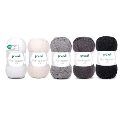 Gründl Wolle Lisa Premium Plain Yarn for Knitting Crochet Soft and Skin Friendly 100% Polyacrylic 5 Balls 50 g / 133 m Needle Size 3.5 4.5 White/Grey/Black
