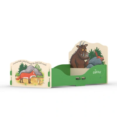 General description A mouse took a stroll through the deep dark wood! The Gruffalo licensed toddler bed is designed for children transitioning from a cot to a ‘grown up’ bed, featuring high-quality graphics that perfectly mimic Julia Donaldson's and Axel Scheffler's The Gruffalo story. This bed is a perfect addition to any Gruffalo or forest-themed bedroom. Technical specifications Material: MDF + Wood Dimensions: L141 x W78.1 x H64.5 cm Weight: 22 kg Mattress Size: 140 x 70 cm Conforms to: BS 8509:2008+A1:2011 Installation Easy self-assembly with clear instructions Slots together with a few screws to secure the base Usage Ideal for toddlers transitioning from a cot Fun and sturdy structure for children