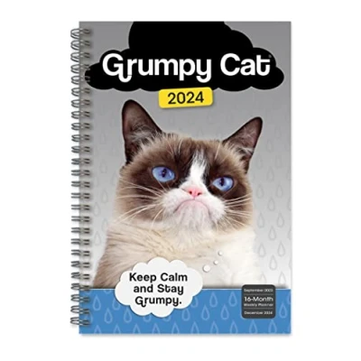 This weekly planner is filled with quintessential Grumpy Cat portraits and memes and will have you laughing out loud for the entire year Convenient 6" x 9" size for desktop or travel September 2023 - December 2024 planner, featuring 16-months of weekly and monthly pages for easy planning, scheduling, at-a-glance calendar reference pages, a notes section for important reminders, projects and long-term planning Printed on high quality paper, premium quality durable cover with spiral wire-o binding allows the calendar to open flat. Front and back jacket flaps with storage pockets good for storing slips of paper and ensure durability. Back cover houses perforated page marker.Includes 16 months of full-week calendar spreads, year-at-a-glance grid views, and reference calendar. Yearly and monthly calendar overview pages help you set goals, stay on track and organized all year long. International products have separate terms, are sold from abroad and may differ from local products, including fit, age ratings, and language of product, labeling or instructions.