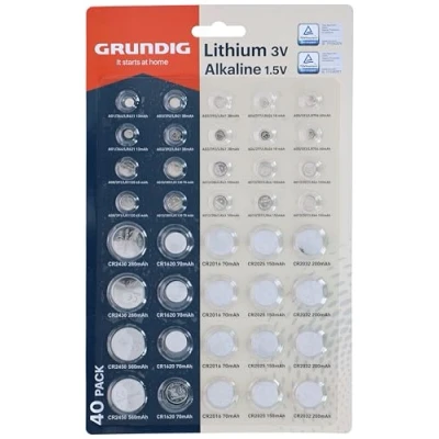 Button cells pack of 40 – comprehensive set of 40 batteries for watches, toys, remote controls. Lithium and alkaline types – 3 V lithium and 1.5 V alkaline for versatile applications. For electronics and more – includes CR2032, CR2025, AG13 and other common types. TÜV tested quality – Grundig batteries with certified performance and reliability. Blister with overview – clear packaging for quick finding and easy use.