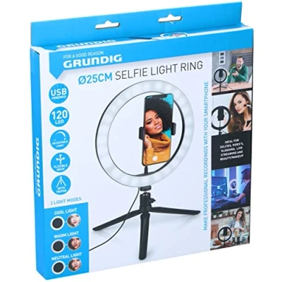For vlogs, tiktok or insta – with this ring light from Grundig, you always have the best lighting for your selfies, vlogs, tutorials, TikTok or Instagram videos, you tube videos or other recordings 12 LEDs - The ring light with 12 LEDs ensures that you always look good. You place the lamp on the table, connect your phone and start filming Cool, warm or neutral – choose your ideal exposure with the different light modes: cool, warm and neutral light. So you always get the effect you want for your videos USB charging: control the ring light discreetly with the multifunctional control button. It is attached to a cable long enough to operate your phone while you are in front of the camera. In this way, you can take the most perfect selfies and shots of yourself. You can charge this selfie light via USB. You can set the tripod higher or lower as you like TIKTOK RINGLIGHT CHALLENGE - With over 500 million views, it is just the latest craze on TikTok: the Ringlight Challenge. What do you need for this? A ring light, you yourself, a dark room and #ringlight and voíla, in one fell swoop, you are TikTok famous