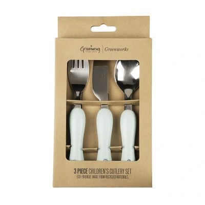 The Greenworks 3 Piece Child's Set Dinosaur Pattern is the ideal solution for parents seeking a fun, durable, and environmentally responsible dining set for their children. Grunwerg’s commitment to sustainability is reflected in the use of recycled ABS plastic and rPET for the cutlery, ensuring that the materials are repurposed and reused rather than contributing to plastic waste. These plastics are commonly used in bottles and food containers, and by utilizing post-consumer and post-industrial rPET plastics, the brand helps reduce waste and conserve valuable resources, making this cutlery set an environmentally conscious choice.This set includes a spoon, fork, and knife, all of which feature full tang construction. The full tang design means the metal extends through the entire length of the handle, providing strength and superior durability. This feature ensures that the cutlery will last through years of use, making it a long-term investment for families. The solid construction also offers a more comfortable grip for little hands, helping children easily transition to using regular cutlery.Designed with young children in mind, the cutlery set features attractive dinosaur-themed illustrations, designed in-house by Grunwerg. These bright, colourful designs bring a touch of adventure to mealtime, helping to engage children and encourage them to enjoy their meals. The playful dinosaur patterns are not only appealing but also foster imagination and creativity in children, making the act of eating more enjoyable and less of a chore.The Greenworks 3 Piece Child's Set Dinosaur Pattern is packaged in eco-friendly materials that are completely recyclable, eliminating plastic waste from the packaging process. This further reinforces Grunwerg’s commitment to reducing its carbon footprint and environmental impact.The set is backed by a 10-year guarantee, ensuring the cutlery will withstand everyday use, making it a reliable and long-lasting choice. Perfect for young kids, the Greenworks 3 Piece Child's Set Dinosaur Pattern offers a combination of sustainable materials, functional design, and engaging visuals, making it a fantastic option for eco-conscious families.