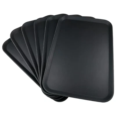 Grunwerg Non Slip Round Food and Drink Plastic Serving Tray with High Grip Rubber Surface, 65 x 45cm, Pack of 6, Black