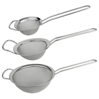 Grunwerg Set of 3 Fine Mesh Sieves with Polished Rim and Handles, 8cm, 12cm 18cm Diameters