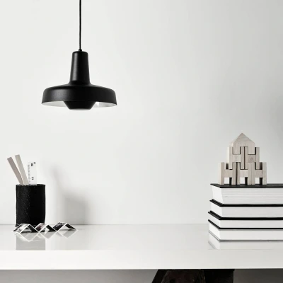 Arigato pendant light – round lampshade with glare shield The single-colour finish and timeless design allow the 1-bulb Arigato pendant light to be combined with numerous interior design concepts. The hanging light from Croatian manufacturer GRUPA is not only ideal for use in the living room or dining room – it can also be used to comfortably illuminate a desk, as the bulb (not included) is placed behind a diffuser. At the same time, the inside of the round aluminium lampshade is painted white, which promotes low-loss light emission. - Made in Europe
