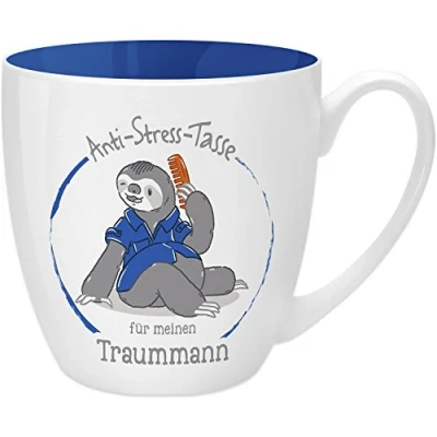 Funny and cheeky sayings: cups with colourful print, sloth cartoon and funny text for a good start to the day. This sayings mug for professions, family and friends brings colour and fresh breath to the table and office. Mug with saying: mug made from new bone china with coloured inner print, sloth motif and saying "anti-stress cup for the dream man", volume 45 cl, diameter 9.5 cm, height 9.7 cm. Very trendy: whether it's llama, sloth or trendy sayings, colours and shapes – we ensure that the latest trends end up at home, with colleagues or in the circle of friends. Ideal gift: as a gift for family, friends, colleagues, as a thank you, for a birthday or just as a fun souvenir and party surprise. Suitable as a gift for girlfriend, mum, dad, grandma, grandpa, brother, sister and for all other favourite people. The brand GRUSS & CO: fresh and trendy in Germany by our traditional company SHEEPWORLD AG on the sheep hill, since 1997.