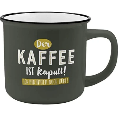 High quality coffee mug made from New Bone China porcelain, mug in nostalgic enamel look. Beautiful mug with decorative cardboard gift ribbon Mug with saying "Der Kaffee ist kaputt", volume approx. 35 cl, dishwasher-safe A suitable gift for a loved one, for birthdays, Christmas or Valentine's Day.