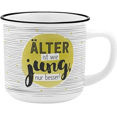 Mug made of new bone china porcelain, coffee mug in nostalgic enamel look Mug with saying "Älter ist wie jung, nur besser", volume approx. 35 cl Coffee cup with decorative gift wrapping made of cardboard, banderole with FSC certification As a gift for a loved one, for a birthday, Christmas or Valentine's Day Capacity; 350.0 ml
