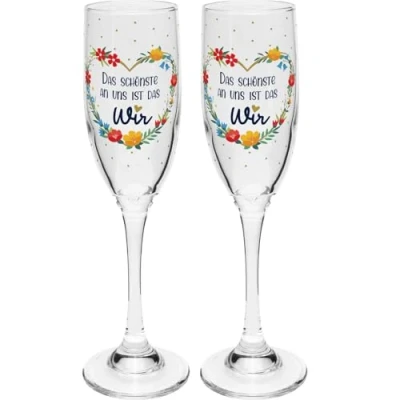 Funny and loving sayings: drinking glasses, champagne glasses and drinking bottles with lovingly designed motifs, modern colour combinations and matching text for a beautifully set table. This Secco glass gift set for two is a stylish table top accessory and also a fun and loving gift. Champagne glasses set for two: the gift set contains 2 champagne glasses in a classic shape, 20 cl capacity per glass, Secco glasses printed in colour with motif decoration and saying, for combining, giving as a gift and as an eye-catcher at the table, for sparkling wine, Secco, delicious alcohol-free sparkling wine or another sparkling soft drink. TRENDY: Whether llama, sloth, avocado or trendy sayings, colours, shapes and material for a natural, sustainable look - we ensure that the latest trends end up at home, with family, friends and colleagues. Ideal gift idea: as a gift for couples, for her, for him, for wedding, engagement and for lovers. As a gift for two, for couples and suitable for him and her, for Valentine's Day, birthday or Christmas. The brand Gruss & Co: Lovingly designed in Germany by our traditional company Sheepworld AG, since 1997 on the Schafhügel in the heart of the Upper Palatinate in Bavaria.